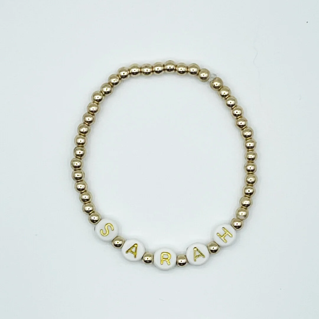 Miss Rae Jewelry Shop Now › Name it bracelet Image 1 of 2 Image 2 of 2 Name it bracelet $16.00 Stretchy string with gold beads and custom name of choice. Leave your name during checkout :) Add To Cart Added! Stretchy string with gold beads and custom name of choice. Leave your name during checkout :)